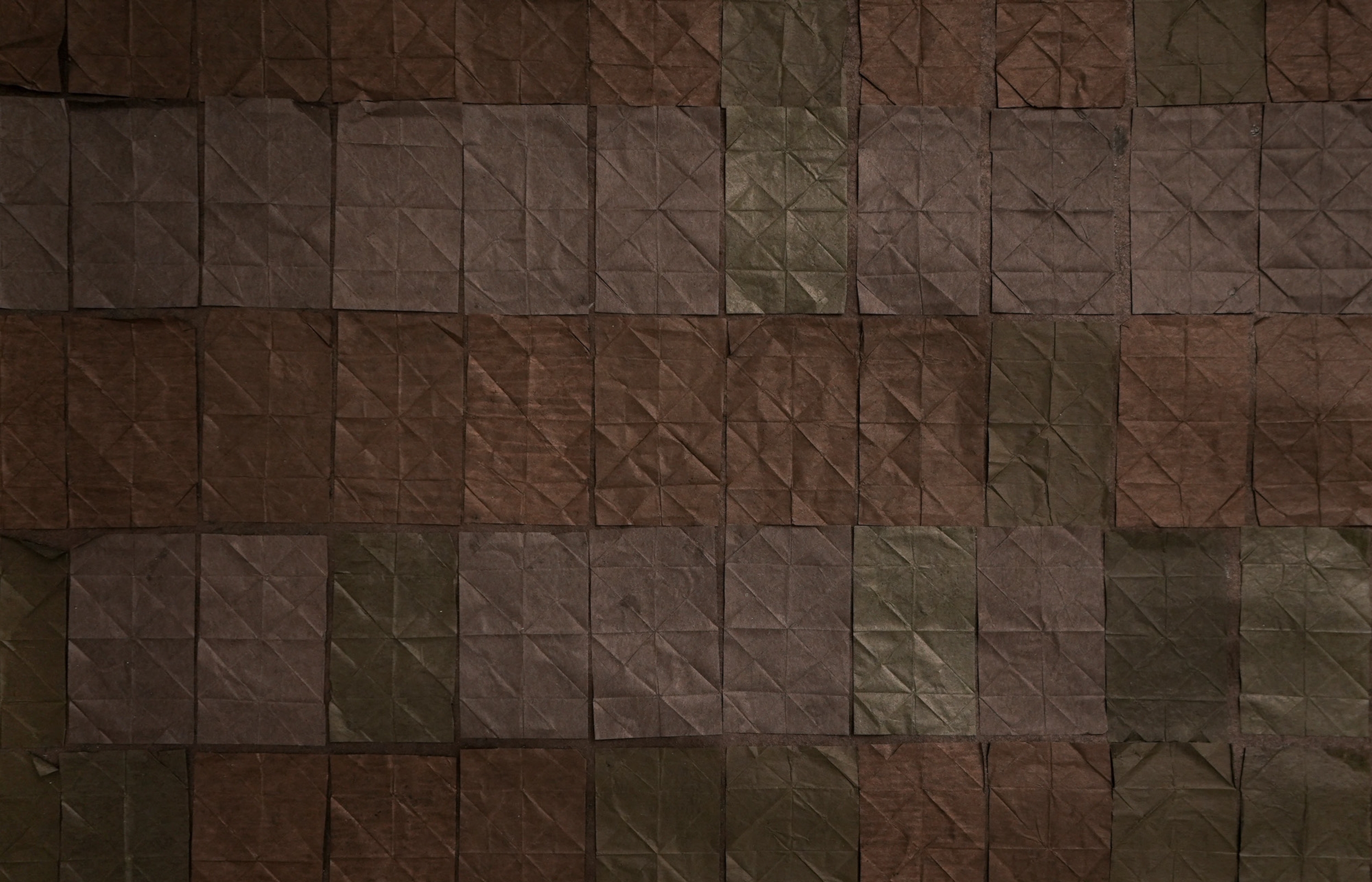 The Boat Series comprises thousands of small origami boats pasted side by side across various canvases. Observed together, individuality is lost. Instead, a fluid motion engulfs a subtle geometric form. While there is movement, its direction remains ambiguous. Each boat is an embodiment of human presence floating in the sea of life.