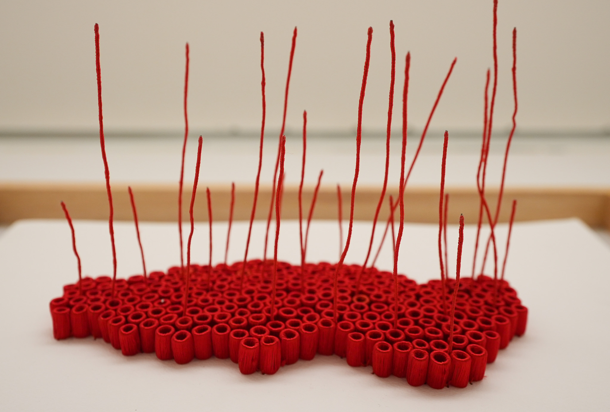 The three-dimensional embroidery is generated by the same circular, meditative and infinite gestures of weaving thread around waste objects; copper wire, transparent plastic tubes, pieces of used CDs, wool, burns from fire, or even ink dyeing, are all part of a meticulously orchestrated internal metamorphosis. The result is a theater of forms, materials, scales, and volumes.