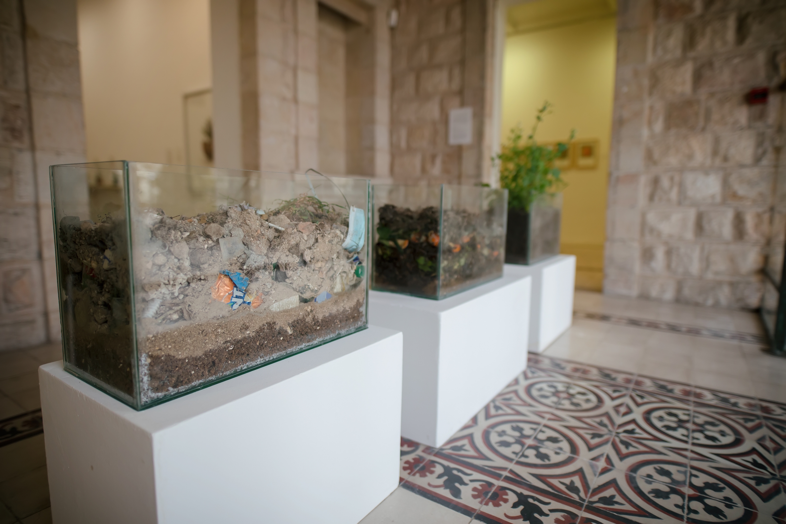 This installation ‘Empty Lands’ is composed of three glass containers that carry three types of soil from the same plot of land, each with different constituents. The first is an untreated sample of soil, the second is transitioning through composting green and brown material, and the third is the final “fixed” sample with more organisms, sprouts, and living elements. The gesture of turning organic materials into healthy soil then back into food is a revolutionary act.
