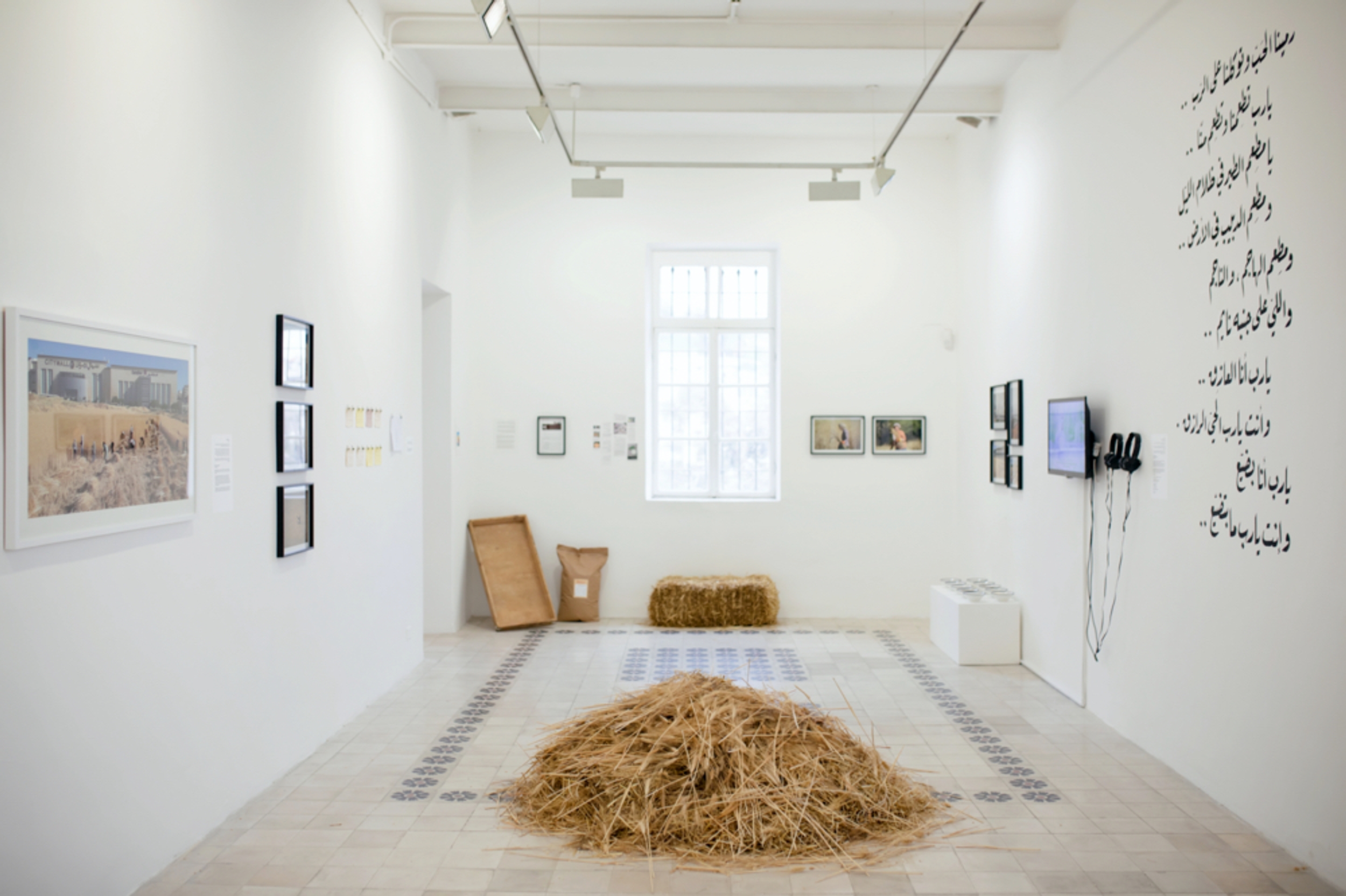 A baydar, or pile of wheat, calligraphy by Al Arrab, and video excerpt from the film ‘Harvest Moon’, directed by Rama Ayasrah, and produced by Mariam Salim and Asmahan Bkerat, with concept and research by Lama Khatieb and Rabee’ Zureikat.